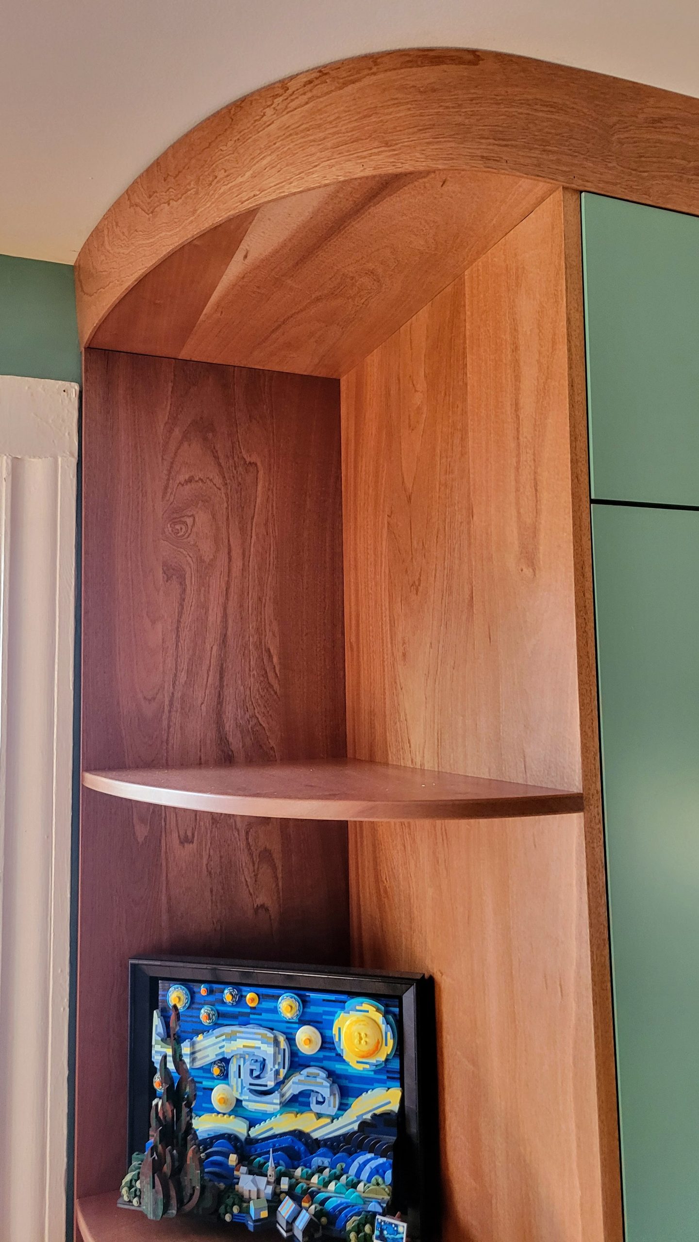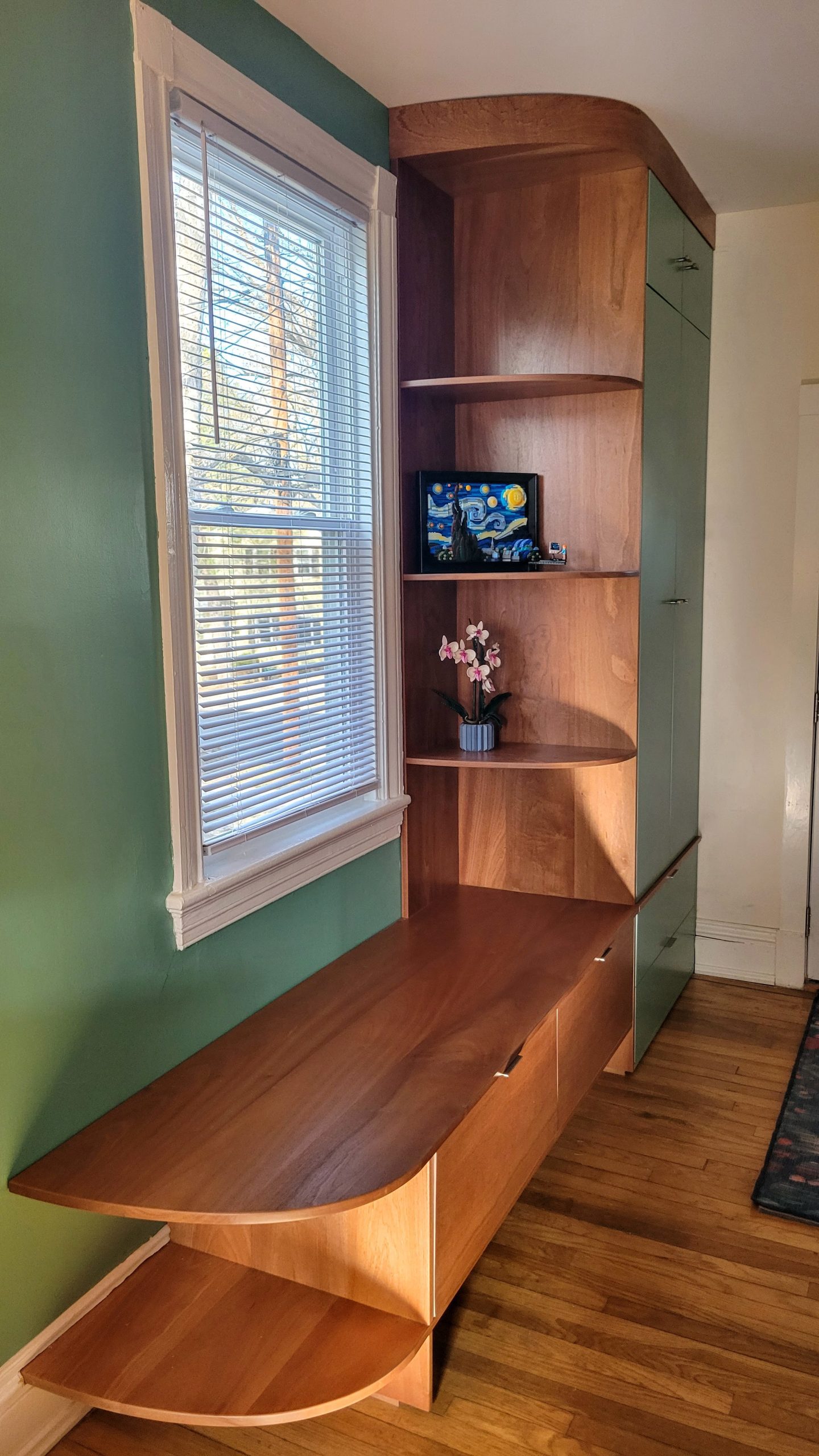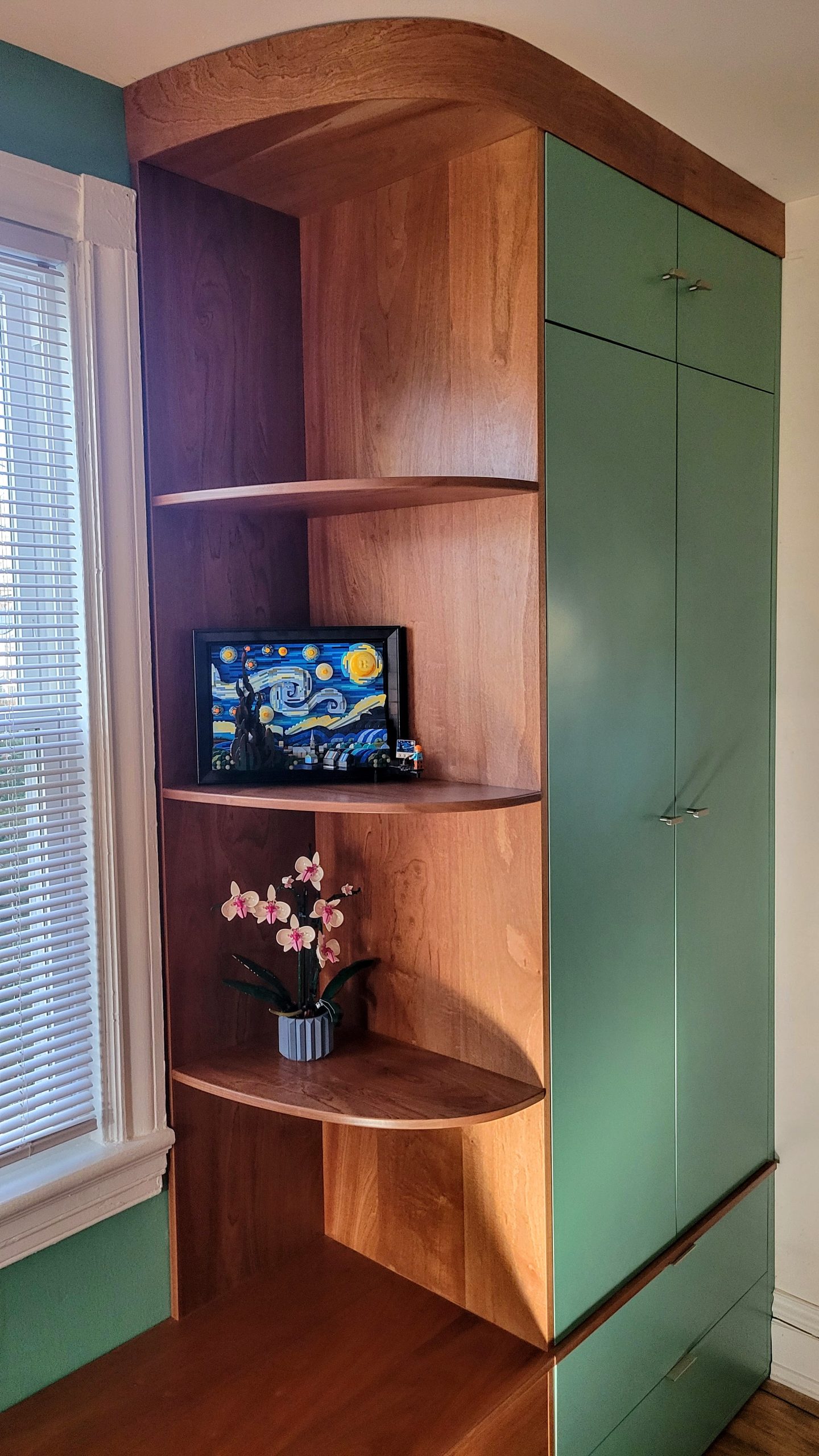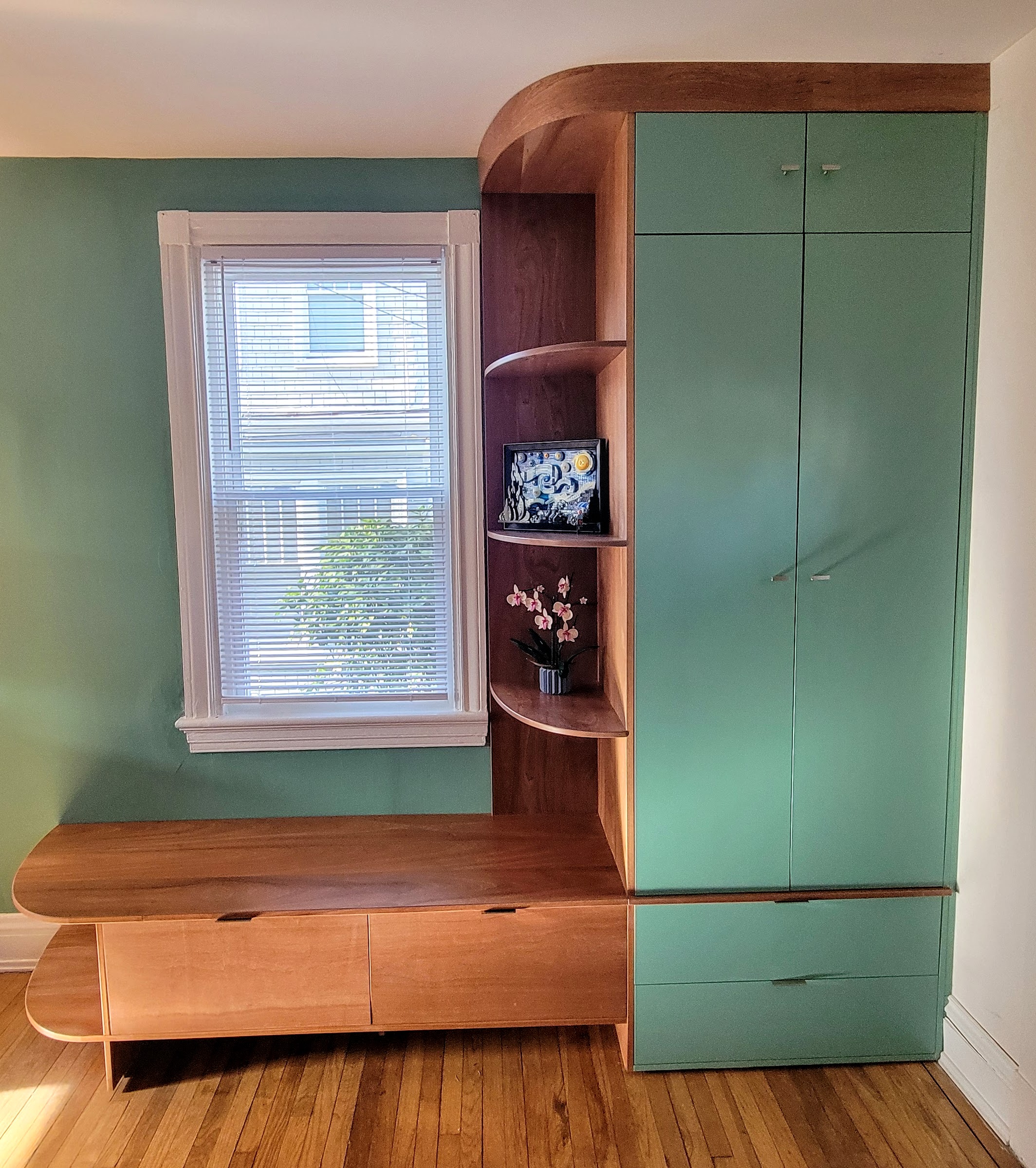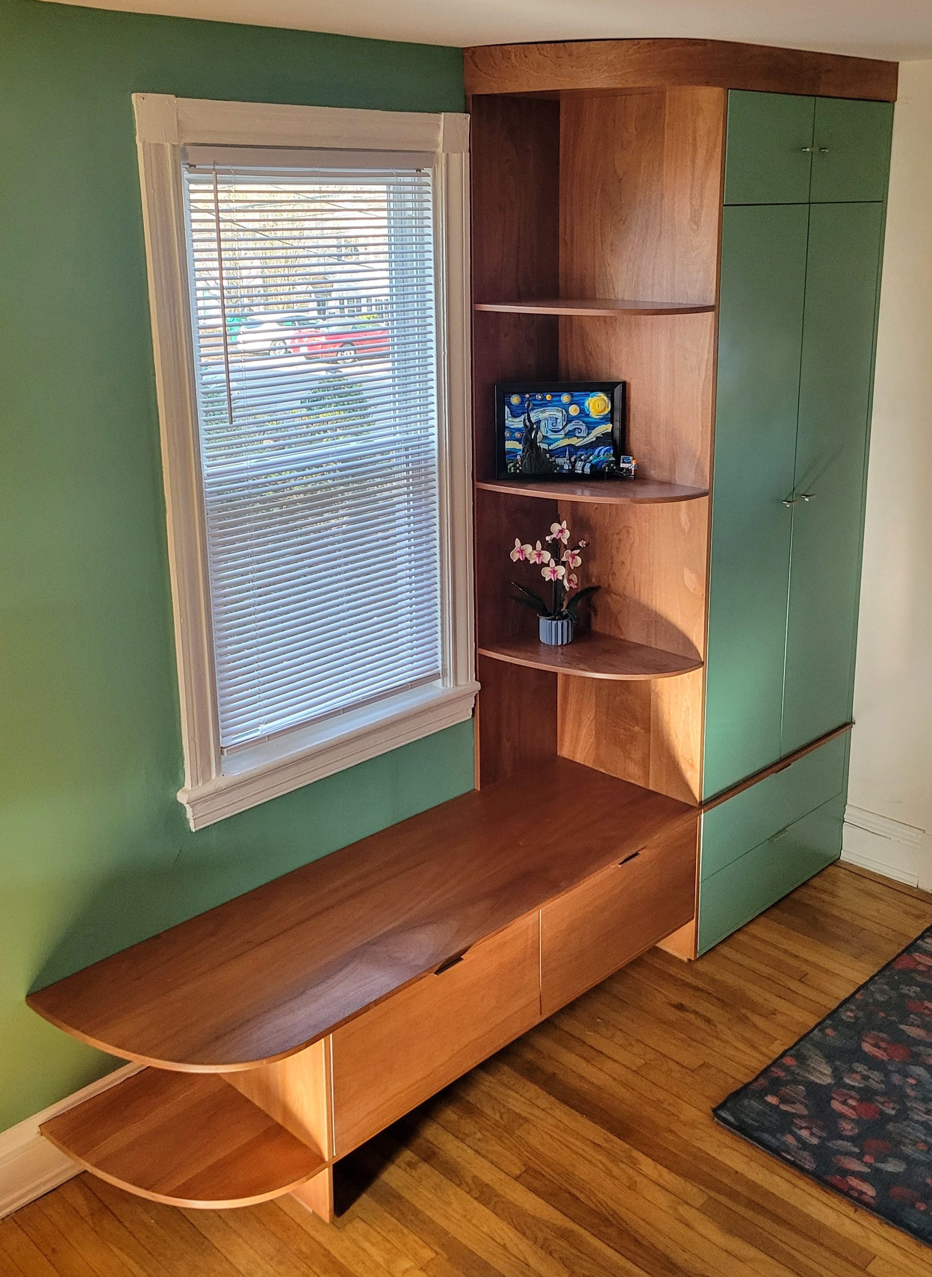 I designed this Mahogany hall tree to fit right in with my client’s mid century decor. The soft curves take an otherwise fairly standard cabinet design to a different level. This client loved the hall tree so much that they commissioned another custom piece of furniture for the same room in their Richmond home.