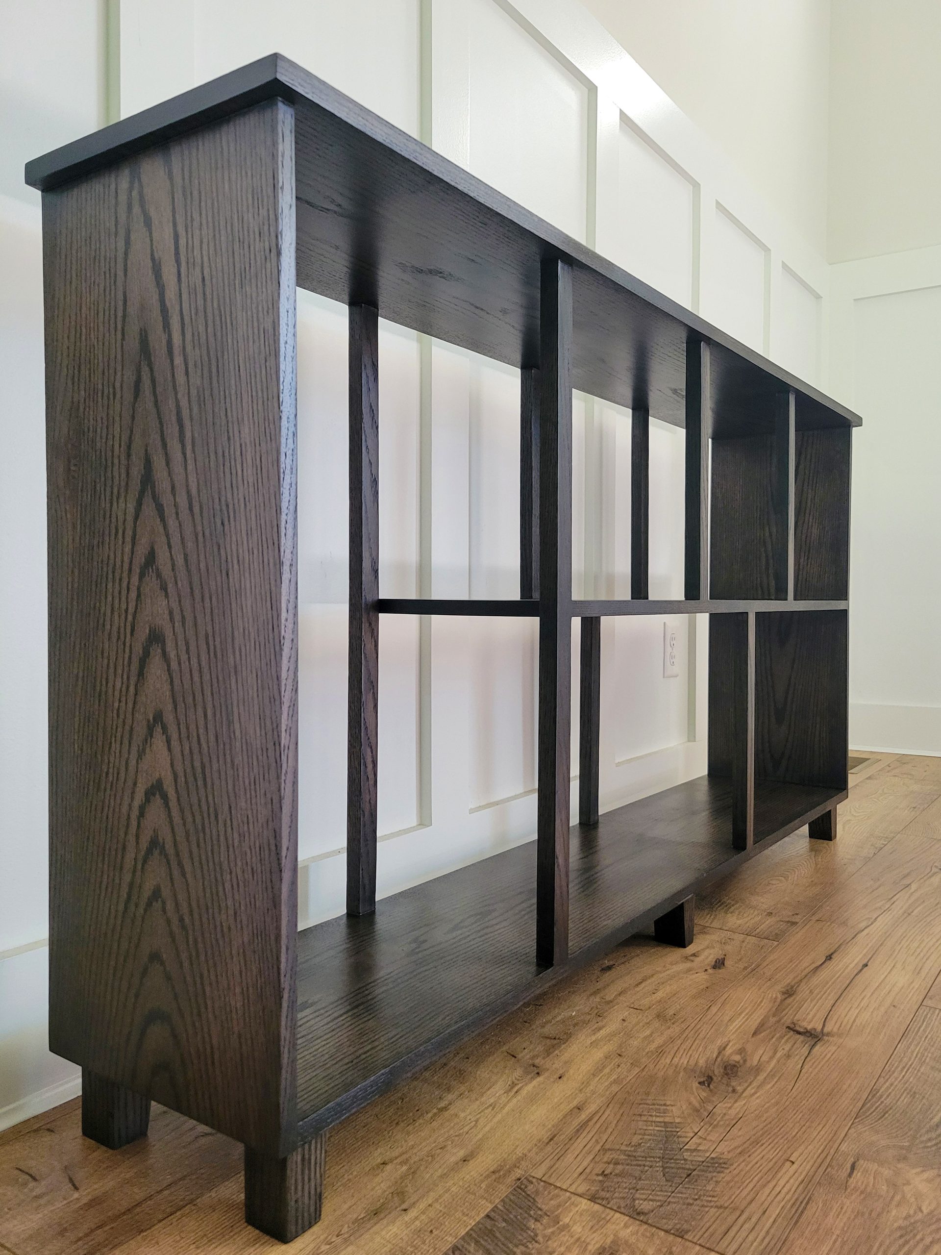 I designed this red oak dark stained bookcase to match the style and color of the client’s current furniture. They wanted something light and open while being strong enough to hold their collection of art books. All of the joinery on this custom furniture piece is hidden using traditional mortise and tenons.